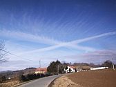 | Cette photo surprenante a été prise sur la route de Latronquière, un dimanche matin du mois de mars 2003, on observe des bandes très larges et des filaments qui s’en dégagent, les tracés géométriques ne peuvent pas correspondre à des passages normaux d’avions de ligne. Le ciel s’est ensuite voilé très rapidement. Il est 11 heures. Les opérations ont ensuite continué pour couvrir entièrement le ciel. |