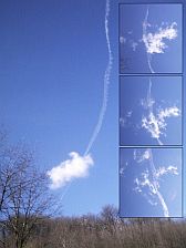 | Sur la photo: désintégration en quelques minutes d’un cumulus par un avion (procédure "Fog and cloud removal") 24-03-2004, Montmurat en Aveyron. |