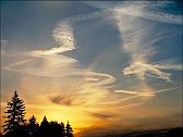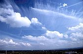ou un éclat soyeux, ou les deux à la fois. Sur cette photo, on peut voir un "Cirrus" dans la partie supérieure de la photo. L'aspect du Cirrus est fibreux (fibratus) et montre en haut à droite, une forme à l'aspect d'un "squelette de poisson" (vertebratus). Il s'agit exclusivement de cristaux de glace qui sont portés par le vent." |